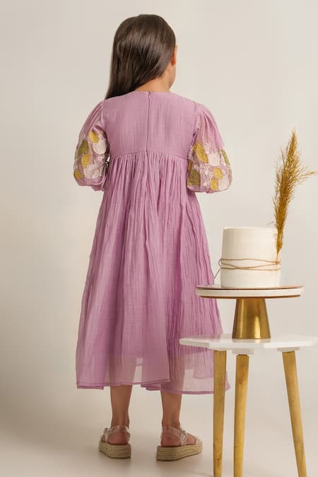 Purple angrakha dress featuring floral applique embroidered yoke and puffed sleeves