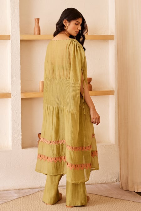 Green Chanderi Silk Leaf Motifs Straight Cora Kaftan And Pant Set