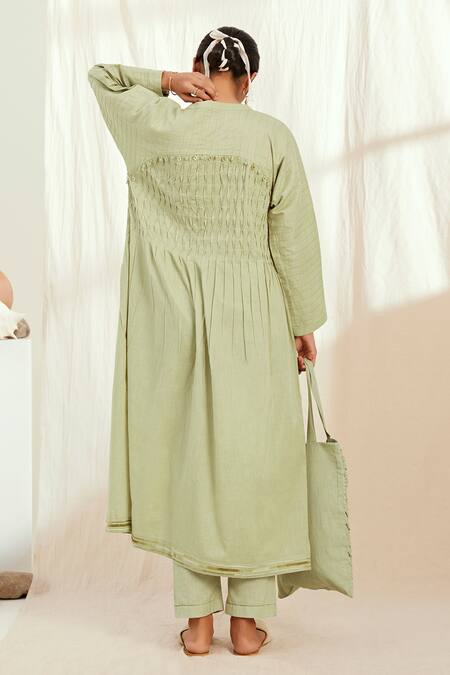 Green long flared jacket with diamond smocking and hangings on the top. Paired with hand smocked bustier and narrow pants.
