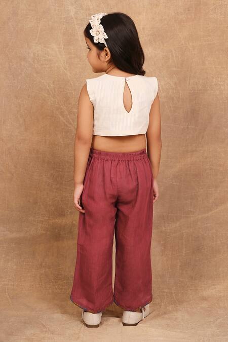 Ivory top featuring floral embroidery and a round neckline. Paired with earthy red wide-leg pants made from handloom organic cotton.