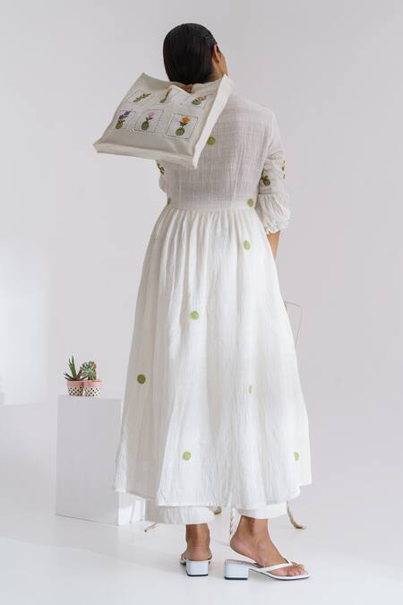 White Handloom Cotton Floral Motifs Lapel Collar Anarkali And Pant Set