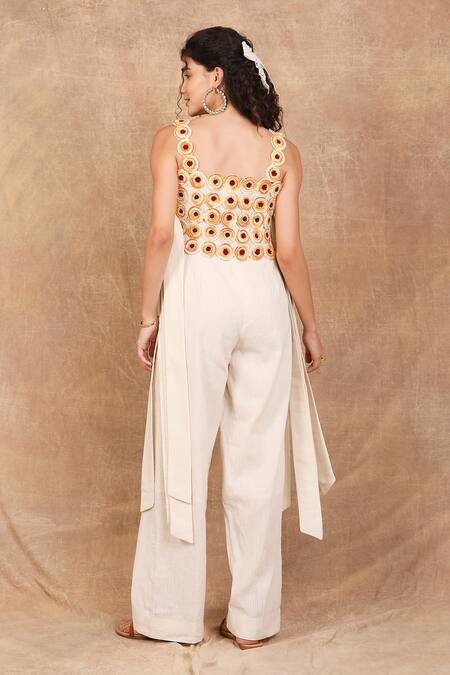 Side tie-up straps for adjustable fit, All-over Marigold zest floral embroidery, Beads embellishments for added texture