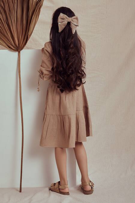 Beige gathered dress featuring kantha detailing and a pleated neckline