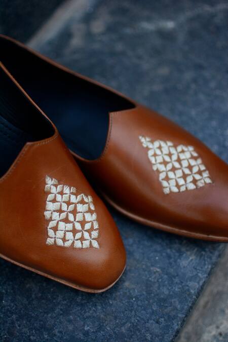 British tan mojris with patina finish, white placement embroidery & stitchline detailing.
