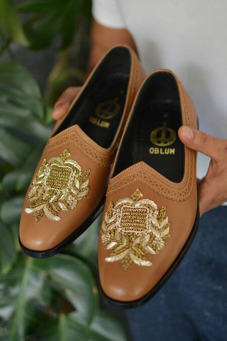 Light tan mojris with patina finish, gold floral placement embroidery & stitchline detailing.