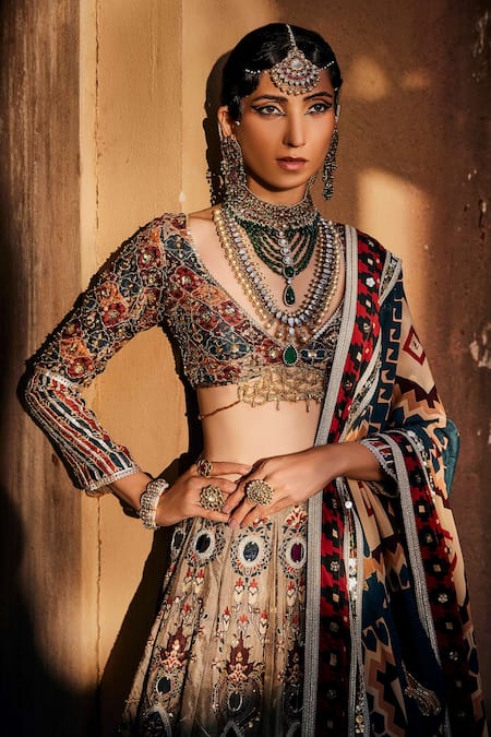 Multicolor lehenga with aztec print & cutdana, floral, sequin, mirror embellishment. Paired with embroidered blouse & dupatta.