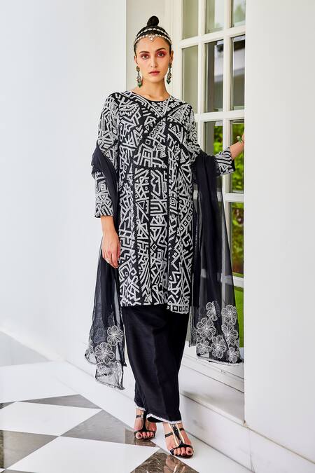 Black and white straight kurta featuring sequin and crochet lace embellishments. Paired with a silk pant and an organza floral applique dupatta.