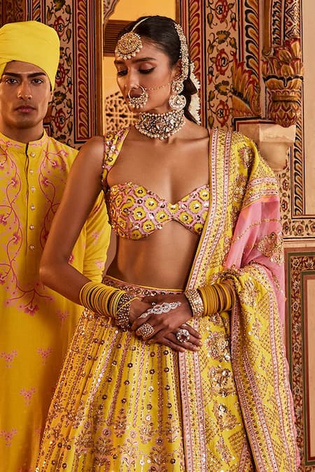 Yellow silk bridal lehenga featuring sequins and beads embellished floral stripes and geometric motifs. Paired with a padded embellished blouse and a coordinating dupatta.