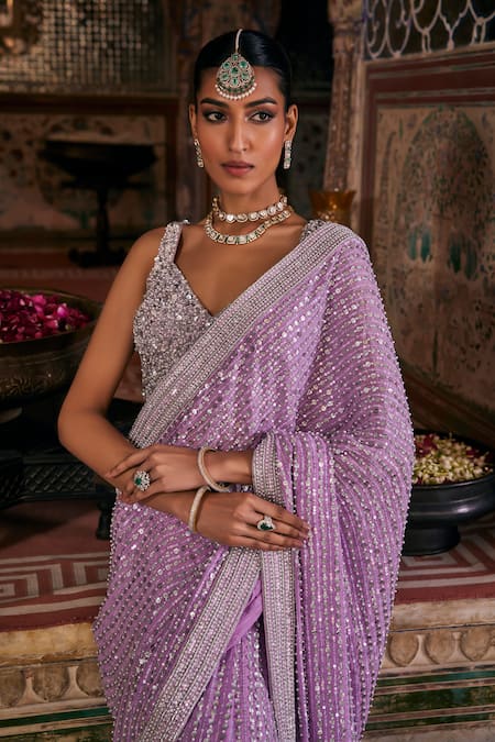Lilac saree featuring all over rainbow sequin, silver dori and pearl embroidery. Paired with an embellished padded blouse and silk petticoat.