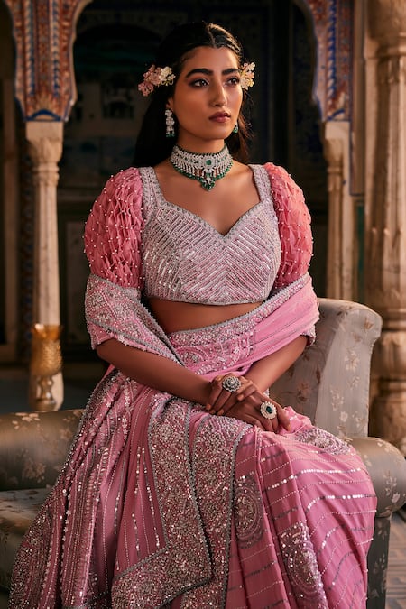 Pink saree featuring intricate sequin, nakshi, and pearl embroidery on a crepe base. Paired with an embellished padded blouse with structured pleats and a silk petticoat.