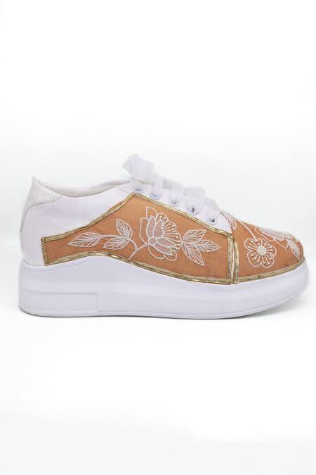 Peach platform sneakers featuring floral pattern with contrast thread and pearl embroidery