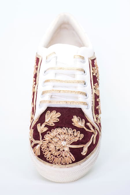 Red & white sneakers featuring floral motifs, bead embellishments, and velvet patchwork detail