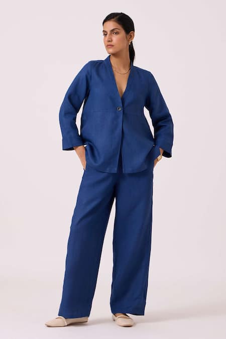 Ink blue linen pant featuring a high waist, wide leg, side panel detail, and an extended bottom hem with button fastening for an adjustable fit.