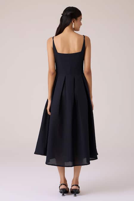 A black midi dress crafted from linen cotton, featuring a square neckline, thin shoulder straps, and a pleated A-line skirt.