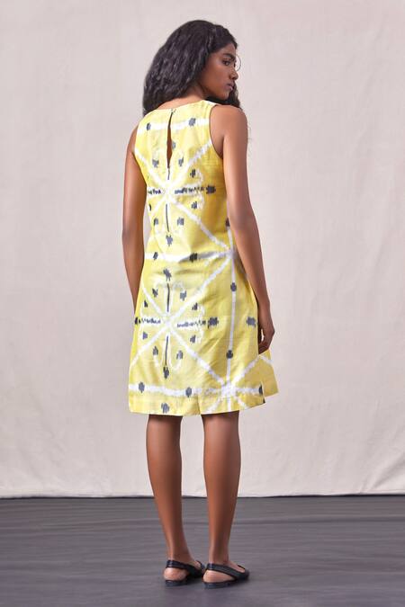Yellow silk cotton dress featuring black and white ikat floral and geometrical motifs