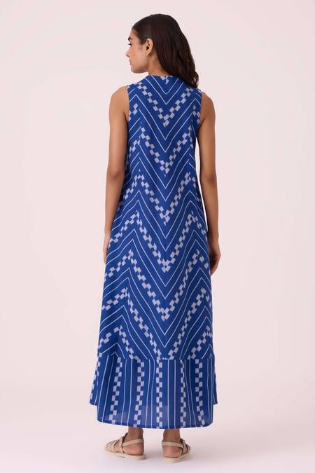 Blue Cotton V-neck Nikol Striped Ikat Dress