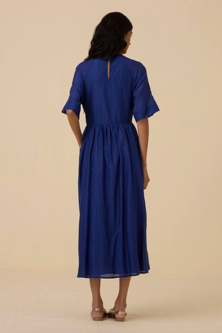 Royal blue dress made from cotton silk featuring a cinched waist and inseam pockets