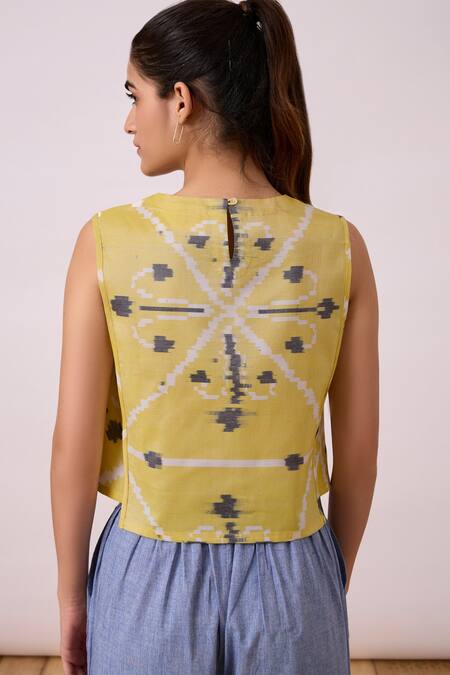 Yellow handwoven silk cotton crop top featuring a round neckline and Ikat pattern