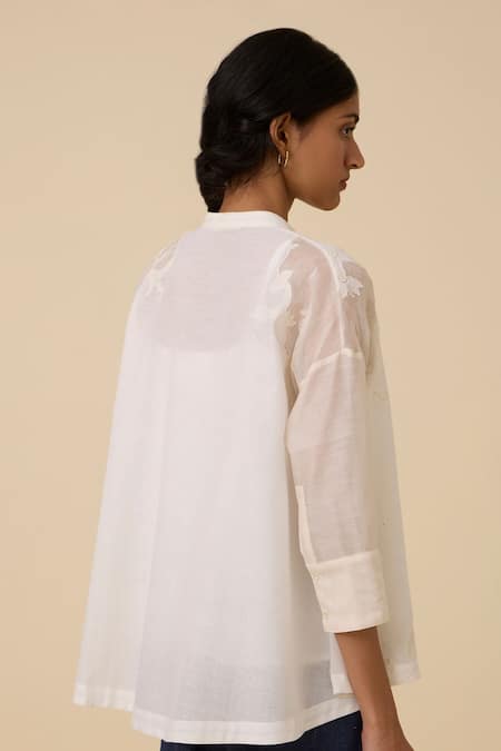 White top featuring floral placement embroidery on the shoulder and a band collar