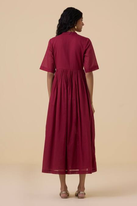 Red Cotton, Voile Embroidery Plunge Neck Sabah Floral Placket Dress