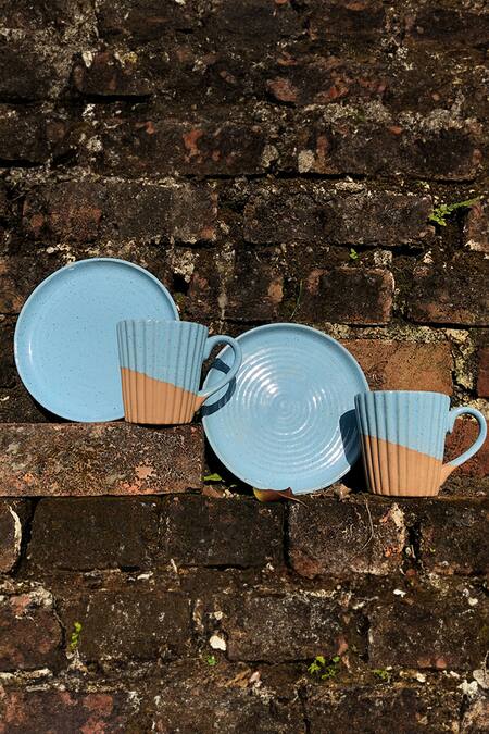Blue Material Stoneware, Base Material Dual Toned Set Of 4 Cup With Plates