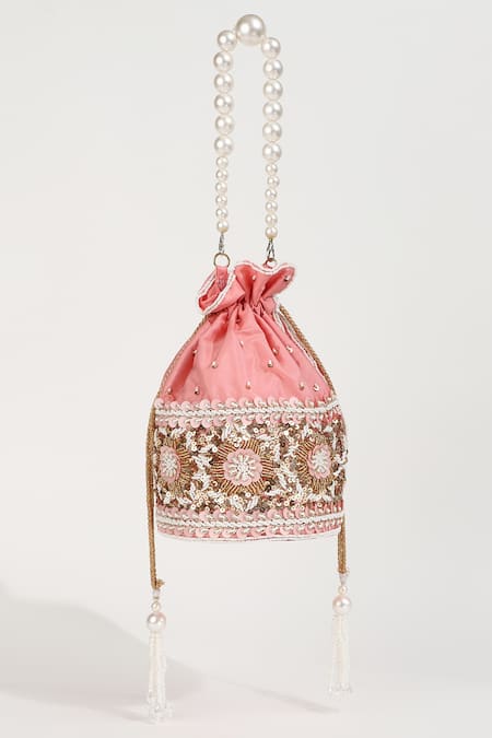 Handcrafted pink potli bag featuring sequins, beaded floral embroidery and a pearl handle