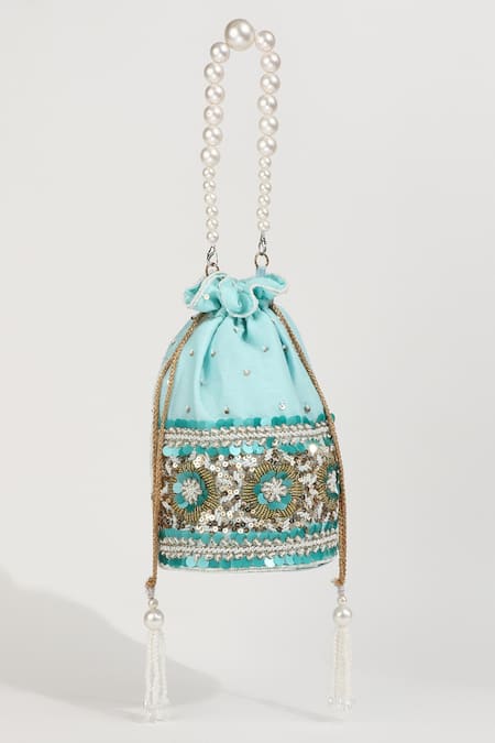 Blue potli bag featuring sequins, beaded floral embroidery, and a pearl handle
