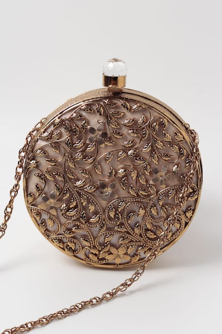 Gold round clutch featuring intricate leaf carved detailing and mother of pearl embellishment on top. Comes with a detachable chain strap for added convenience.