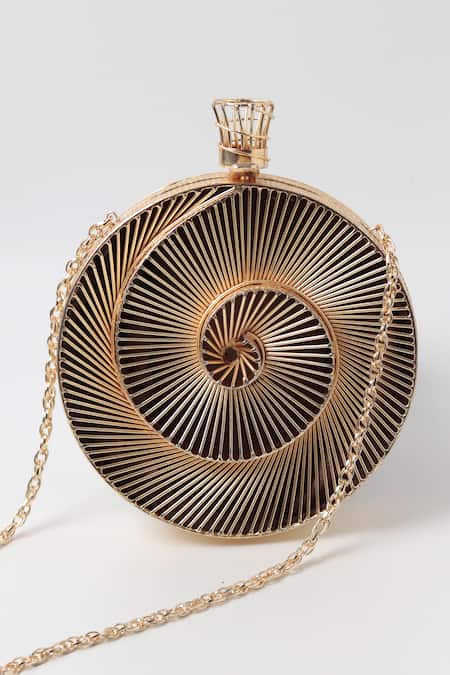 Gold round shaped clutch featuring intricate brass metal wire work