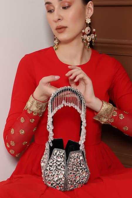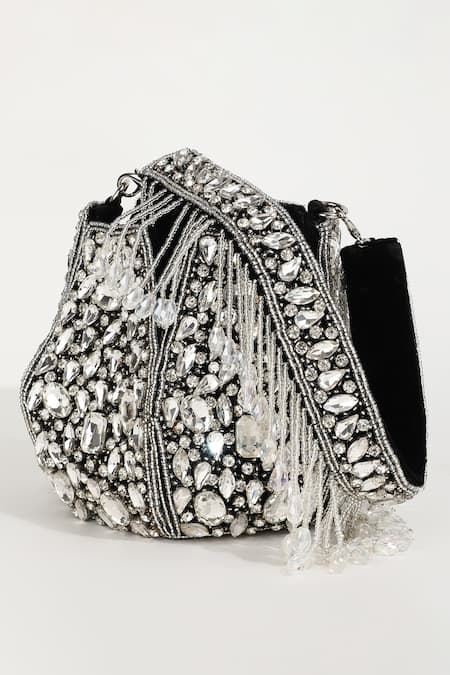 Black velvet potli bag featuring crystal and stone embellishments. Comes with a detachable chain strap adorned with pearl drops.