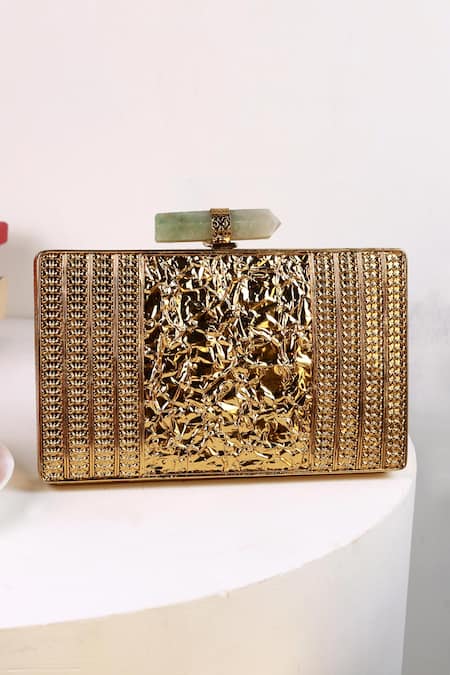 Buy_The Tan Clan_Gold Gemstones, Stones, Metallic Thread Krysty Mother Of Pearl Brass Clutch