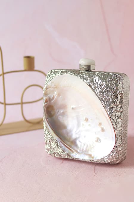 Silver square shaped clutch featuring intricate detailing with a mother of pearl exterior