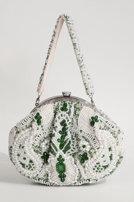 White velvet potli bag embellished with cutdana, pearls, and green glass beads. Includes a detachable pearl embellished handle.
