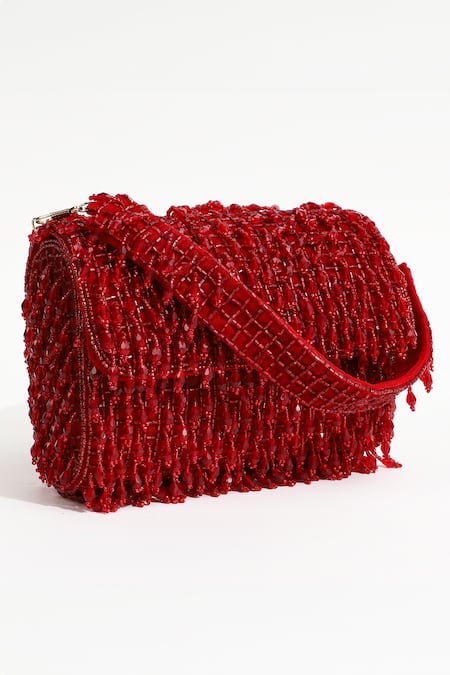 Shop_The Tan Clan_Red Beads, Embroidery Rosa Stone Embellished Flap Over Clutch _Online_at_Aza_Fashions