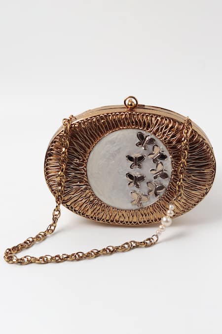 Gold clutch featuring mother of pearl embellishments with butterfly detailing