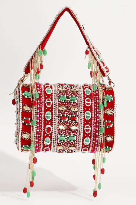 Buy_The Tan Clan_Red Pearls, Beads Wedlock Embellished Clutch With Detachable Handle_at_Aza_Fashions