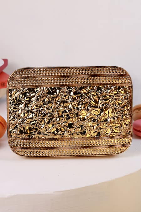 A rectangular brass clutch featuring a gold-toned wire mesh overlay with scattered embellishments.