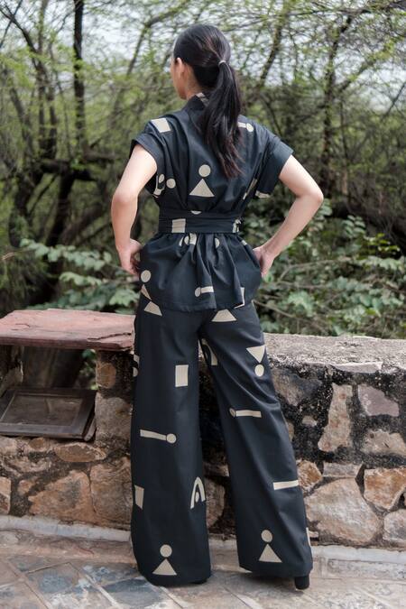 Black Organic Cotton Printed Geometric Shawl Collar Berlin Jacket With Belt