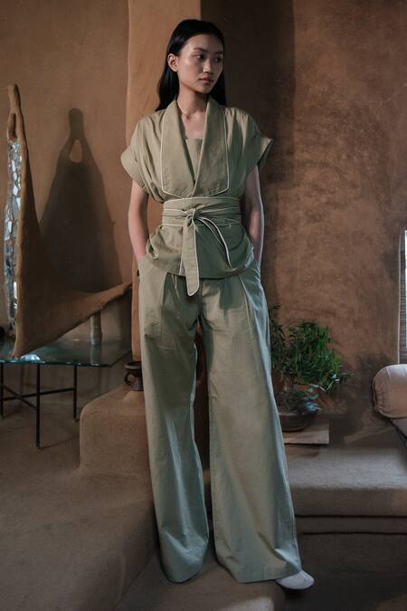 Beige shawl collar jacket featuring contrasting piping detail and a coordinating tie-up belt. Paired with a separate top and pant not included in the sale.