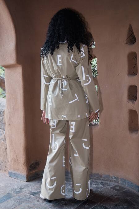 Beige Organic Cotton Printed Line Lapel Collar Pattern Oversized Blazer