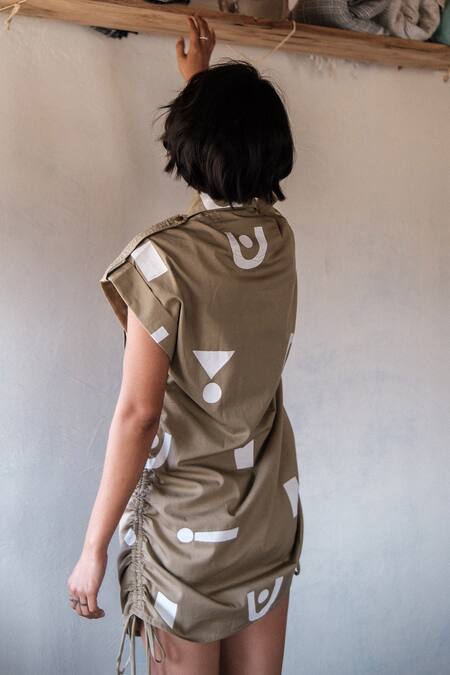 Beige shirt dress featuring a triangle print with side gathers and patch pockets
