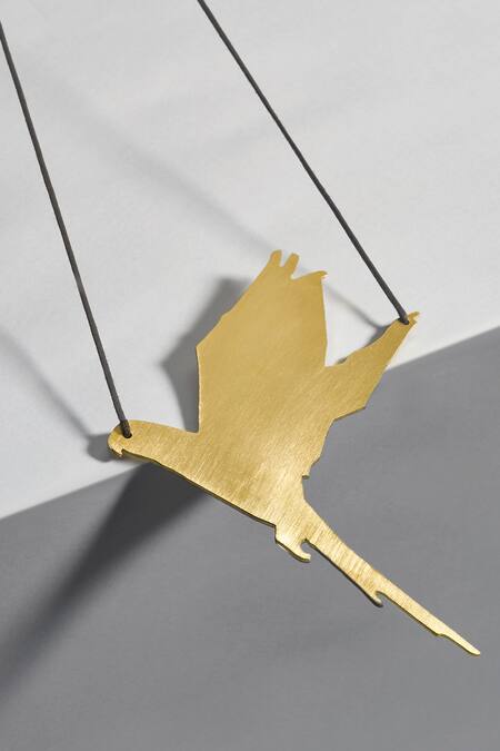 Gold toned long necklace with flying bird carved design pendant.