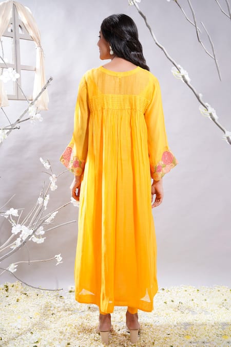 Yellow gathered anarkali featuring floral embroidered sleeves and cross smock details. Paired with leggings and a slip for complete coverage.