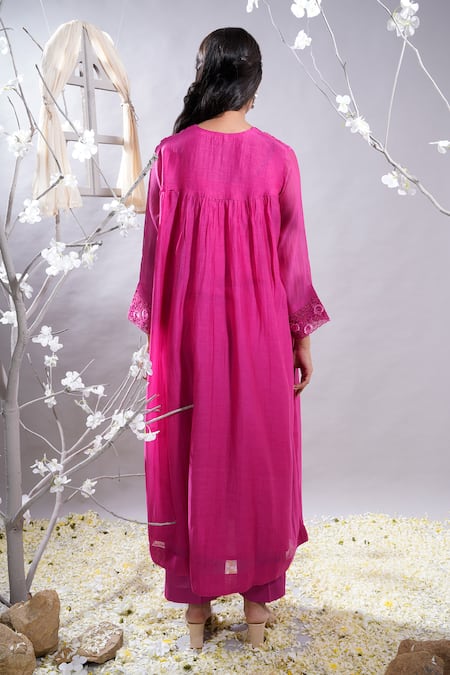 Fuchsia pink gathered anarkali featuring floral, cord & badla work embroidered organza yoke. Paired with a matching palazzo and slip.