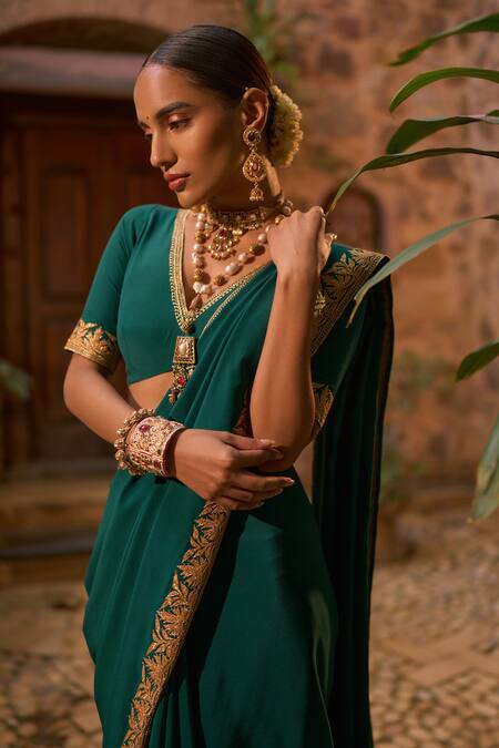Green saree featuring Kashmiri tilla work with a chinar leaf border. Paired with a matching padded blouse with a plunging V neckline and half sleeves.
