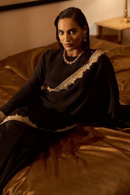 Black saree featuring intricate hand embroidered paisley chinar leaf border with Kashmiri tilla work. Accompanied by a matching padded blouse in pure crepe silk with full sleeves and round neckline.