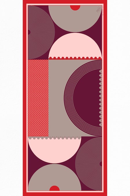 Red dupatta featuring geometric half circle prints and a contrast stripe border