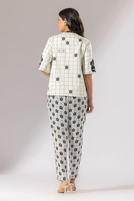 Ivory Silk Satin Open Neck Checkered Fleur Print Kimono Jacket