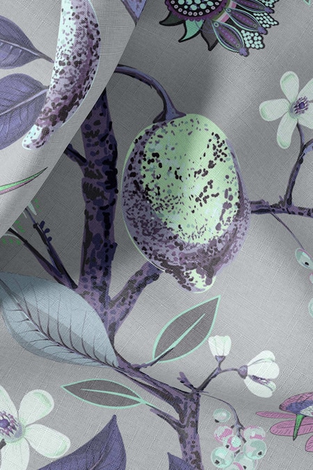 Purple printed cotton scarf featuring hummingbird and lemon motifs