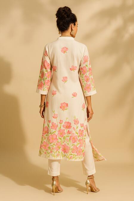 Ivory Cotton, Cambric Collared Phoolwari Kurta With Pant